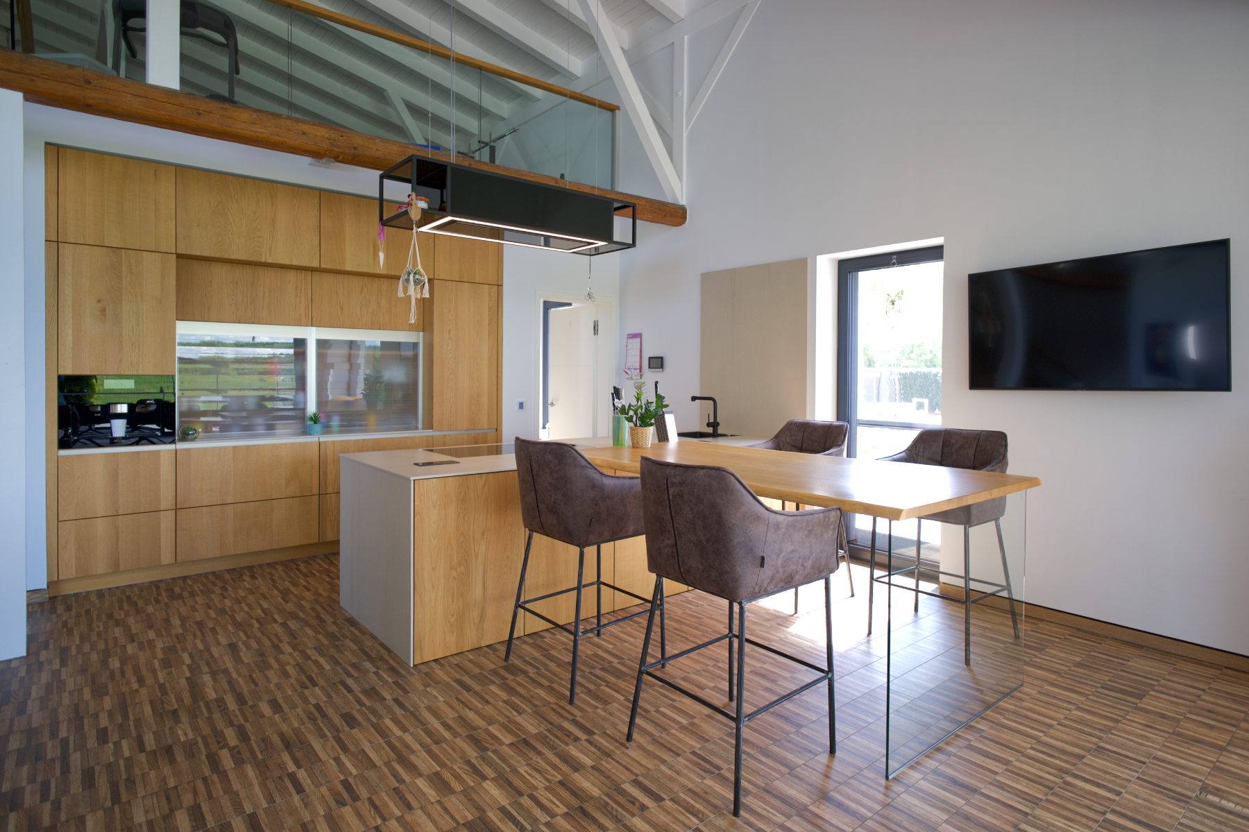 Eine hochwertige Einbauküche mit Eichenechtholzfronten und Keramikarbeitsplatten sowie die Kochinsel mit Miele Geräten lassen keine Wünsche offen. Hinter der Hauptküche befindet sich eine diskrete, funktionale Zweitküche, die als Erweiterung des Koch- und Arbeitsbereichs dient. Sie ist ideal für die Zubereitung größerer Mahlzeiten, das Backen oder das Spülen abseits des Gästebereichs. Die Küche ist mit zusätzlichen Arbeitsflächen, einem Spülbecken, Lagerflächen sowie Kühl- und Gefrierschränken, Ofen und Geschirrspüler ausgestattet.