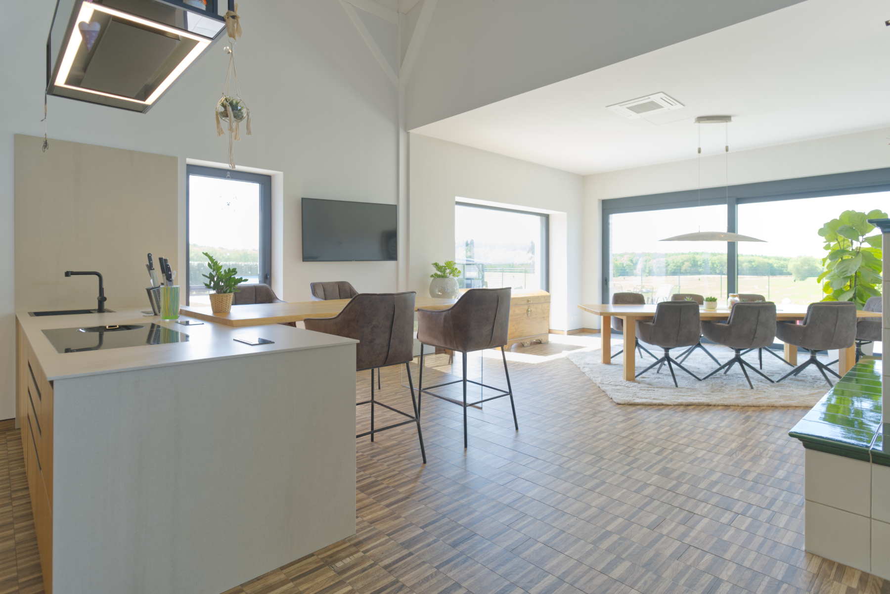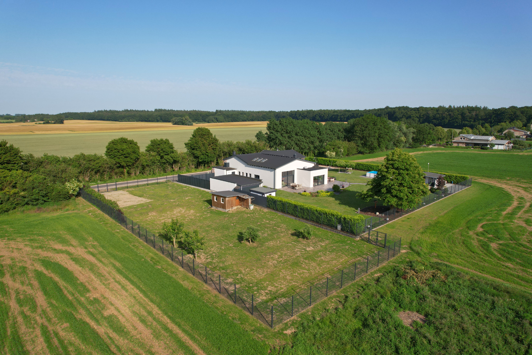 Dieses außergewöhnliche Anwesen bietet nicht nur exklusiven Wohnkomfort, sondern vor allem die perfekte Grundlage, um professionelles Arbeiten und privates Leben auf höchstem Niveau zu vereinen. Auf insgesamt 507 qm Wohnfläche und zwei Grundstücken mit 4.962 qm entsteht ein Umfeld, das sowohl Ruhe als auch Raum für geschäftliche Aktivitäten bietet – ideal für Selbstständige, Unternehmer, Kreative oder Menschen, die ein repräsentatives Arbeitsumfeld zu Hause benötigen. Bereits im Erdgeschoss ermöglichen mehrere großzügige Räume eine professionelle Nutzung: Die drei flexibel gestaltbaren Zimmer bieten sich ideal für Büroarbeitsplätze, Besprechungsräume, Therapie- oder Praxisräume, ein Atelier oder eine Kanzlei an. Der offen konzipierte Wohn- und Essbereich mit seinem zentralen Grundofen kann zudem hervorragend für Kundengespräche in hochwertiger Atmosphäre genutzt werden. Der angrenzende Wirtschaftsraum mit rund 20 qm bietet optimale Voraussetzungen als Technikraum, Lager, Aktenarchiv oder administrativer Bereich. Die Galerie im Obergeschoss erweitert das Potenzial: Die offene und lichtdurchflutete Architektur schafft ein inspirierendes Umfeld für kreative oder konzeptionelle Arbeit. Gleichzeitig erlaubt die großzügige Fläche die Einrichtung eines ruhigen, separaten Arbeitsbereichs fernab des Hauptgeschehens – ideal für Fokusphasen, vertrauliche Gespräche oder hybrides Arbeiten. Die angeschlossene Wellnesszone mit großer Sauna sorgt für Regeneration und Ausgleich im direkten Anschluss an den Arbeitsalltag. Das Nebengebäude bietet mit seiner beheizbaren Doppelgarage und einem Vorraum mit Wasseranschluss zusätzliche Möglichkeiten für berufliche Nutzungen: ob Werkstatt, Studio, Materiallager, Showroom oder Fahrzeugflotte – hier findet professionelle Infrastruktur ihren Platz. Der Geräteschuppen ergänzt diese Kapazitäten sinnvoll. Auch das große zweite Grundstück erweitert die beruflichen Optionen: zusätzliche Parkflächen für Kunden, ein Bereich für Firmenfahrzeuge, der Bau weiterer Arbeits- oder Lagerräume oder die Einrichtung einer ruhigen Outdoor-Arbeitszone – alles ist möglich. Die unverbaubare Aussicht und die ruhige Lage bieten eine inspirierende Arbeitsumgebung, in der Konzentration und Kreativität gefördert werden. Gleichzeitig ermöglichen Pool, Gartenhaus, Spielplatz und hochwertige Außenanlagen eine perfekte Balance zwischen anspruchsvoller beruflicher Tätigkeit und entspanntem Familienleben.