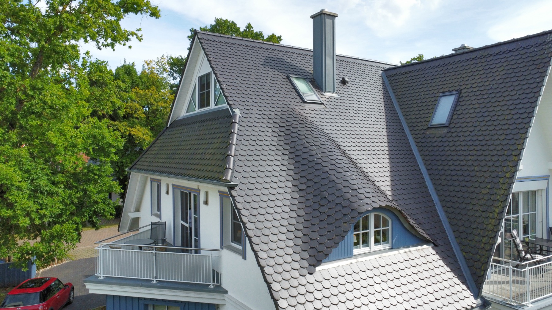– Hartdacheindeckung (Biberschwanz) – Krüppelwalmdach mit Frontspieß und Gauben